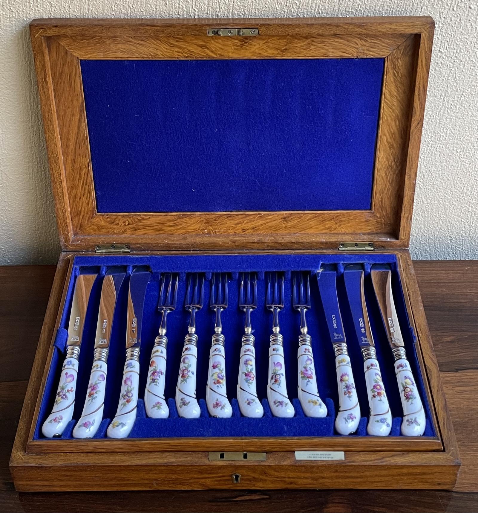 A superb quality set of Edwardian solid silver and porcelain dessert knives and forks for six, hallmarked London 1906 by Carrington & Co.