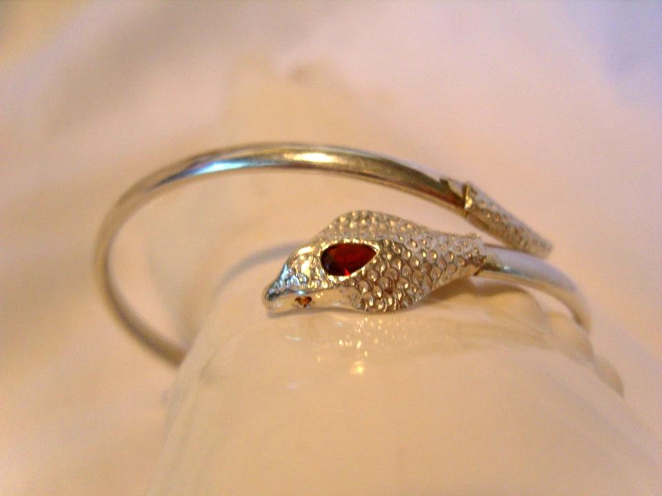 Silver Snake Bangle 925 Ruby Glass Eyes Victorian Style Bracelet 7" Length 1970s