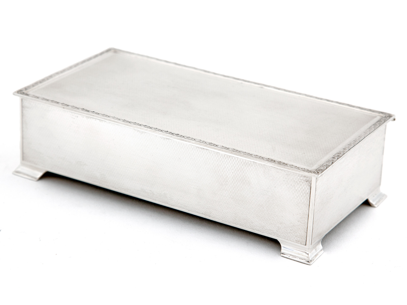 Silver Table Cigar or Cigarette Box with Engine Turned Lid & Floral Scroll Border