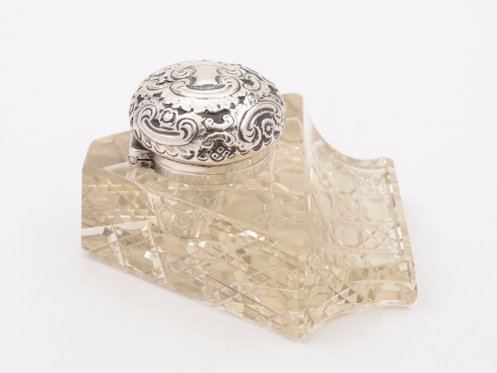 Silver Topped & Cut Glass Ink Pot & Pen Tray