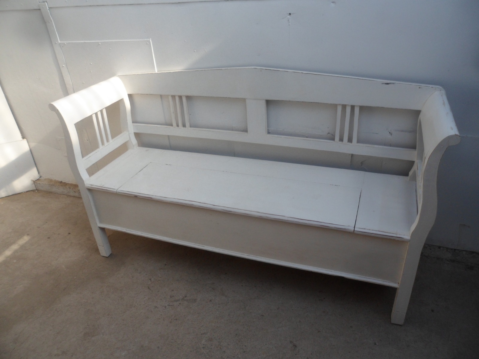 Simple Painted White Spindle Old Pine 2/3 Seater Box Settle / Bench
