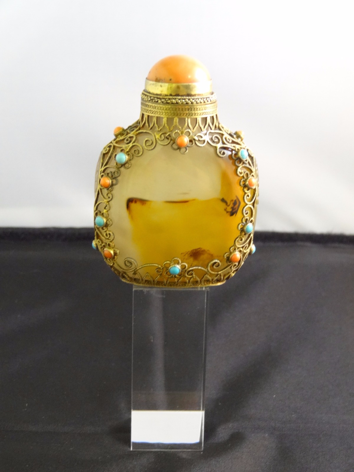 Sino-Tibetan Agate Snuff Bottle, Gilt-Metal Filigree Mounts, Late 19th Century