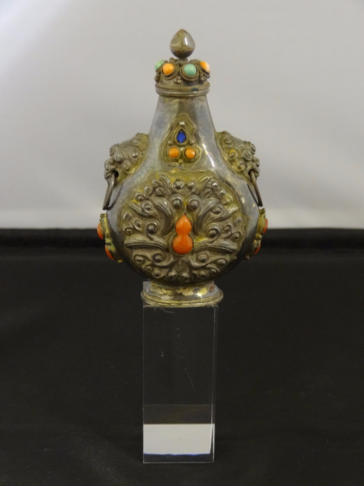 Sino-Tibetan Silvered Metal Snuff Bottle, Inlaid Corals & Turquoises, 19th Century