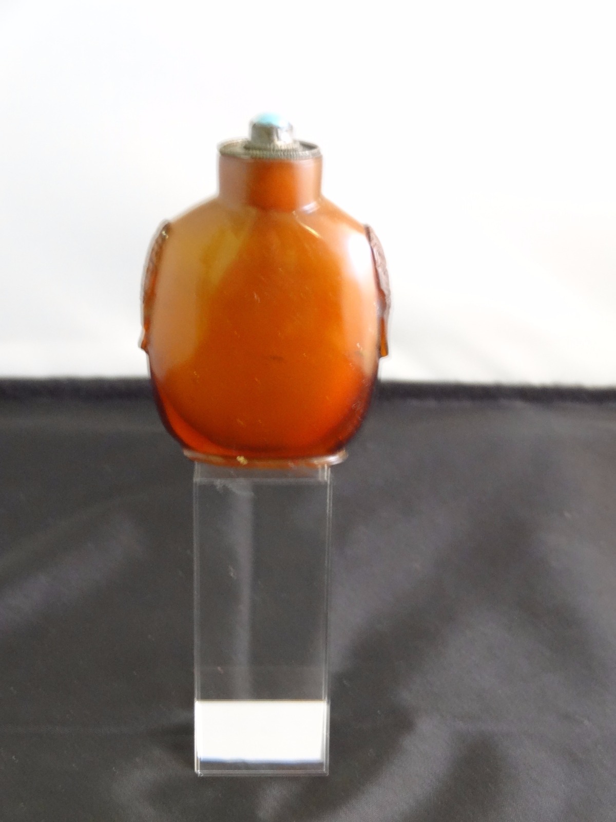 Sino-Tibetan Simulated Carnelian Snuff Bottle, Relief Carved Buddhist Lion Mask, circa 19th Century