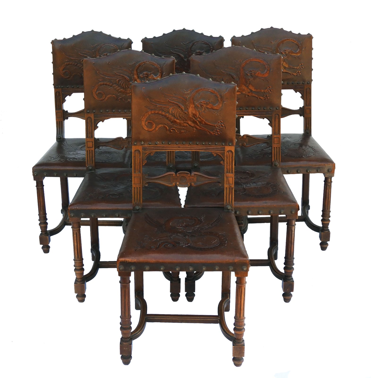 Six Antique Dining Chairs Gothic Revival Walnut & Dragon Embossed Leather c.1890