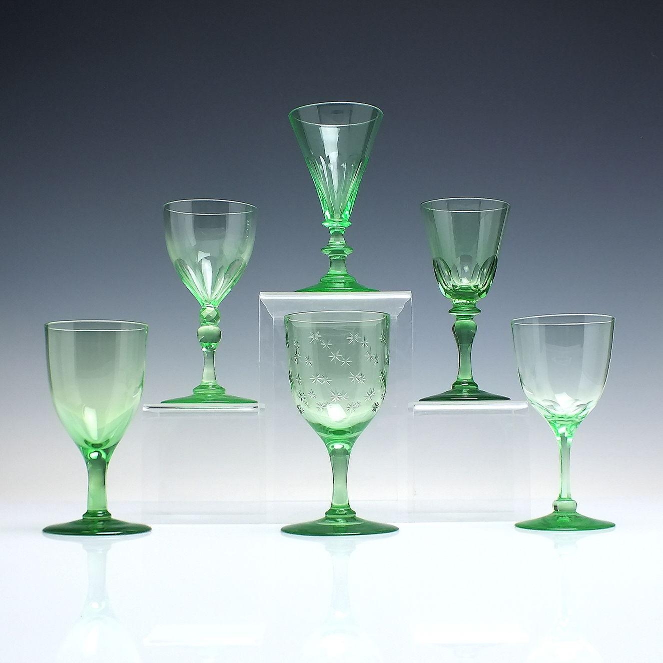 A fine collection of six late 19th Century Victorian antique vaseline wine glasses dating to c1880. Each one is different, three of them cut and 1 engraved with stars, different knops and polished pontils. Just as useful today as they were 150 years ago.