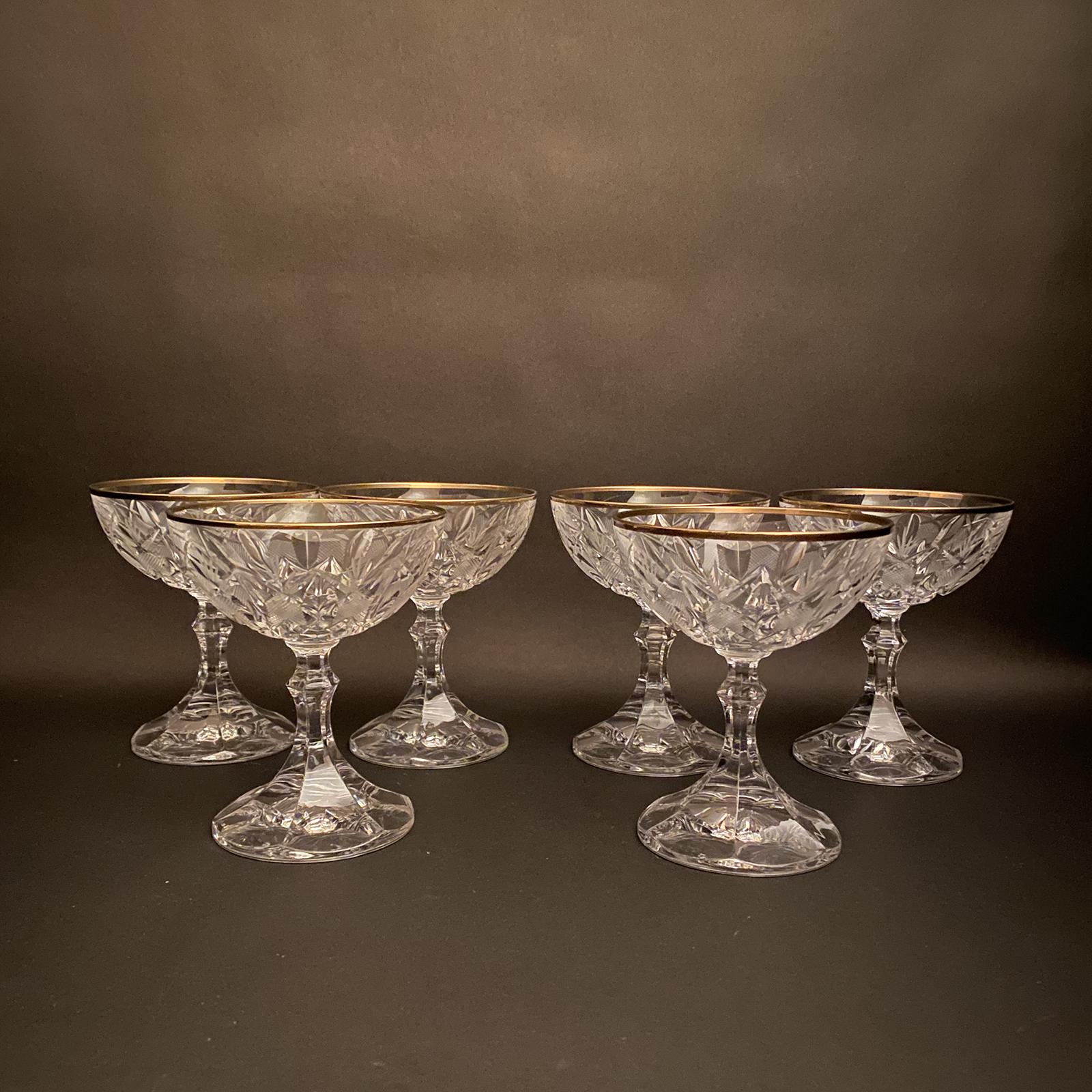 Six Art Deco Gold Rim Crystal Champagne Coupes