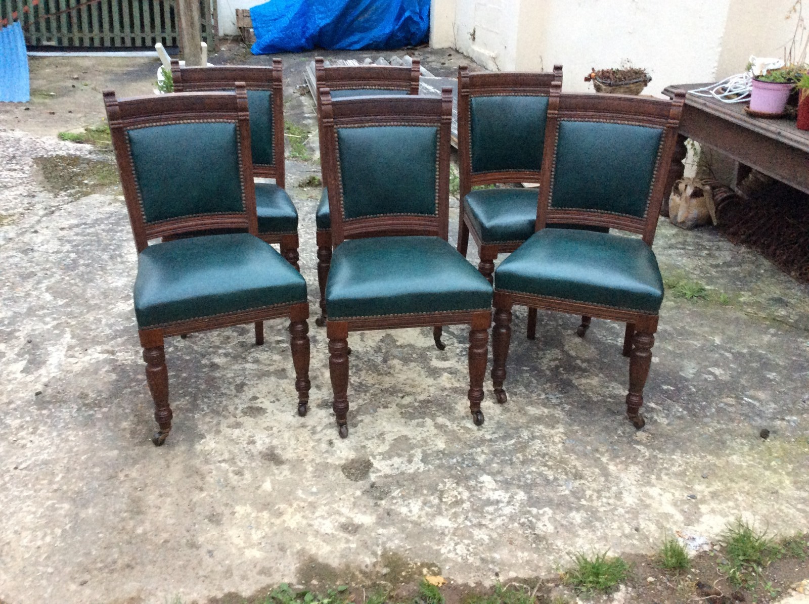 Six Solid Oak Edwardian Dining Chairs with Green Leather c.1900 / 1910