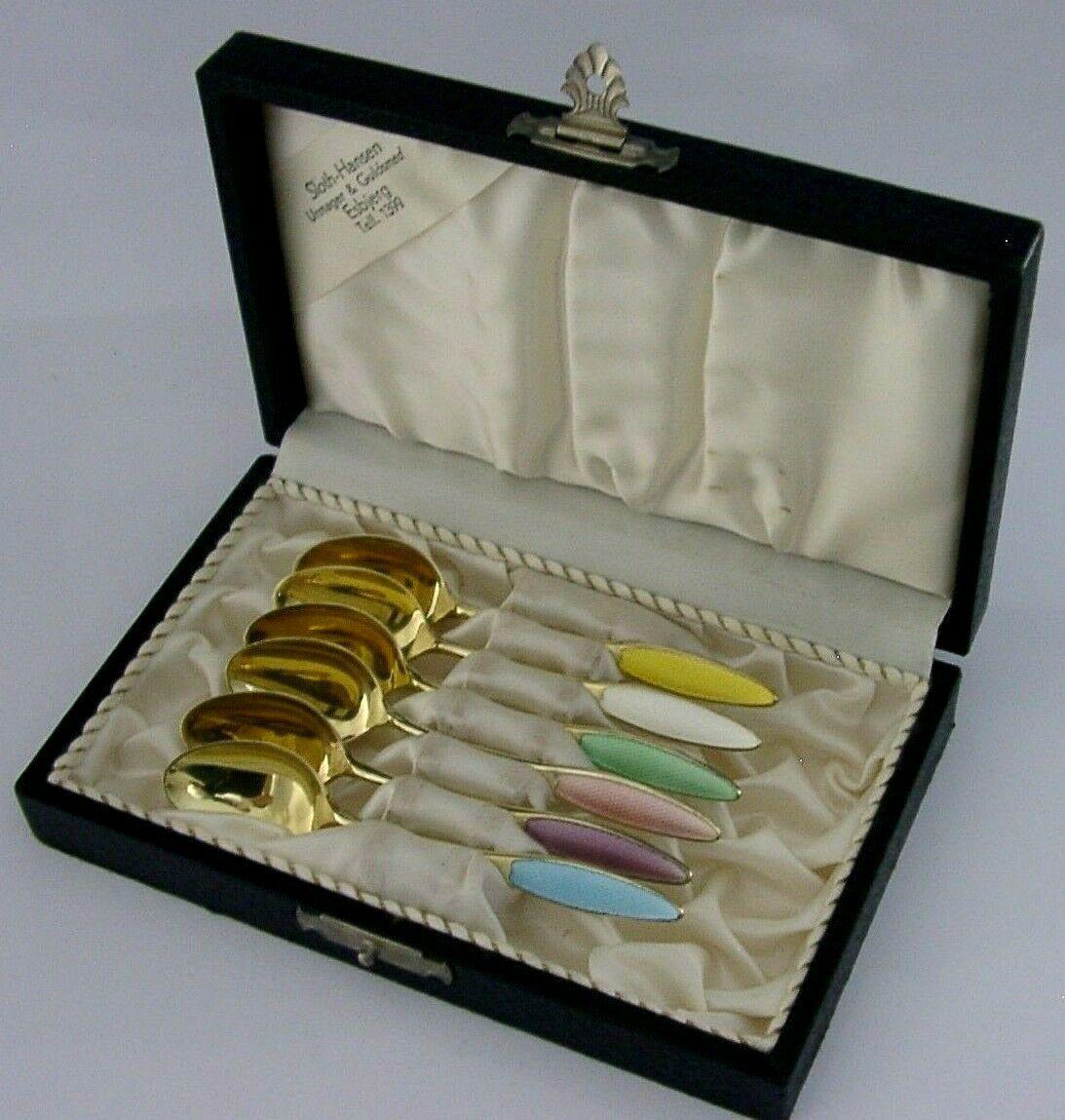 Six Stunning Cased Danish Solid Sterling Silver Gilt Enamel Spoons c.1960