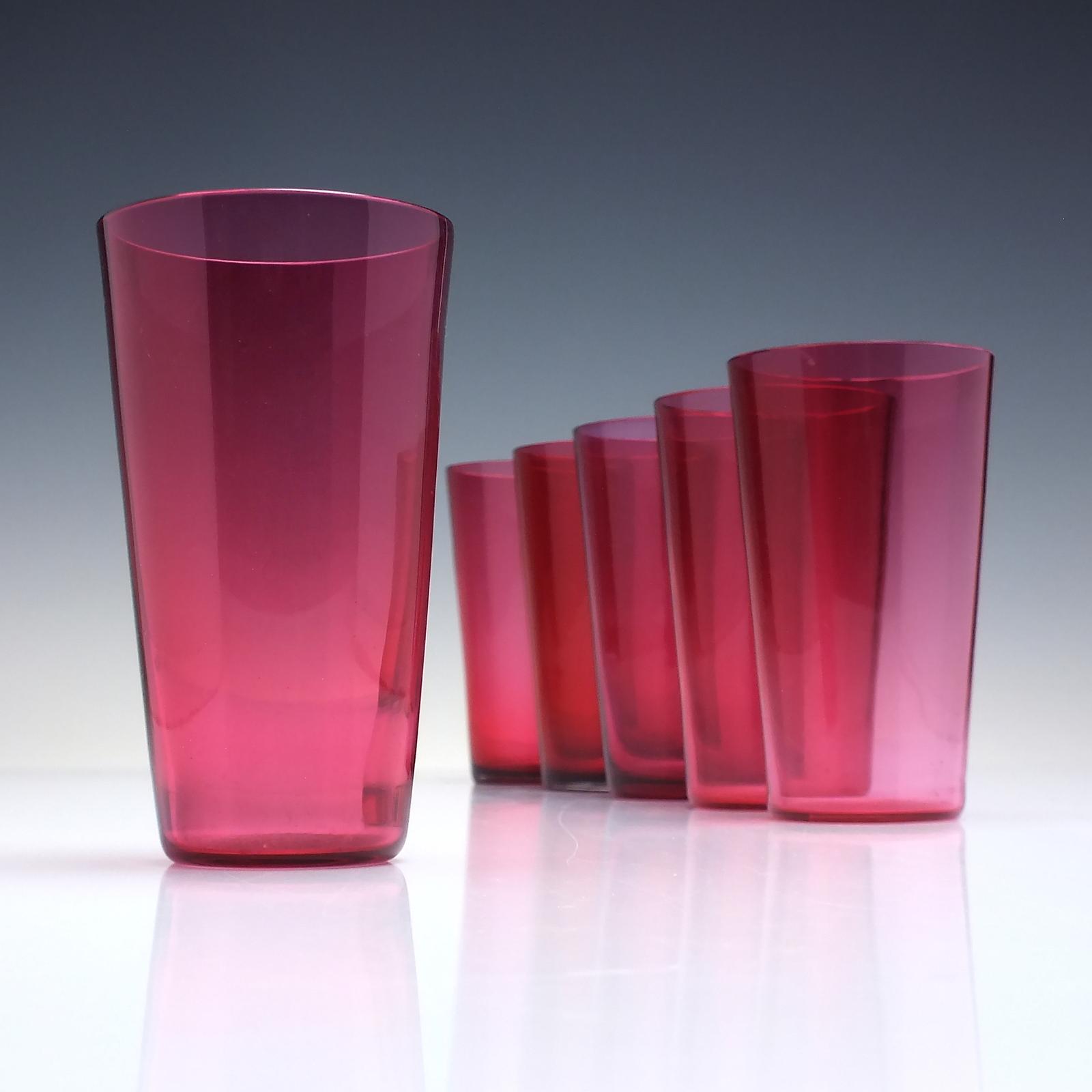 A superb set of six Victorian Cranberry Glass Tumblers dating to c1880. They have tapered bowls and polished pontils.