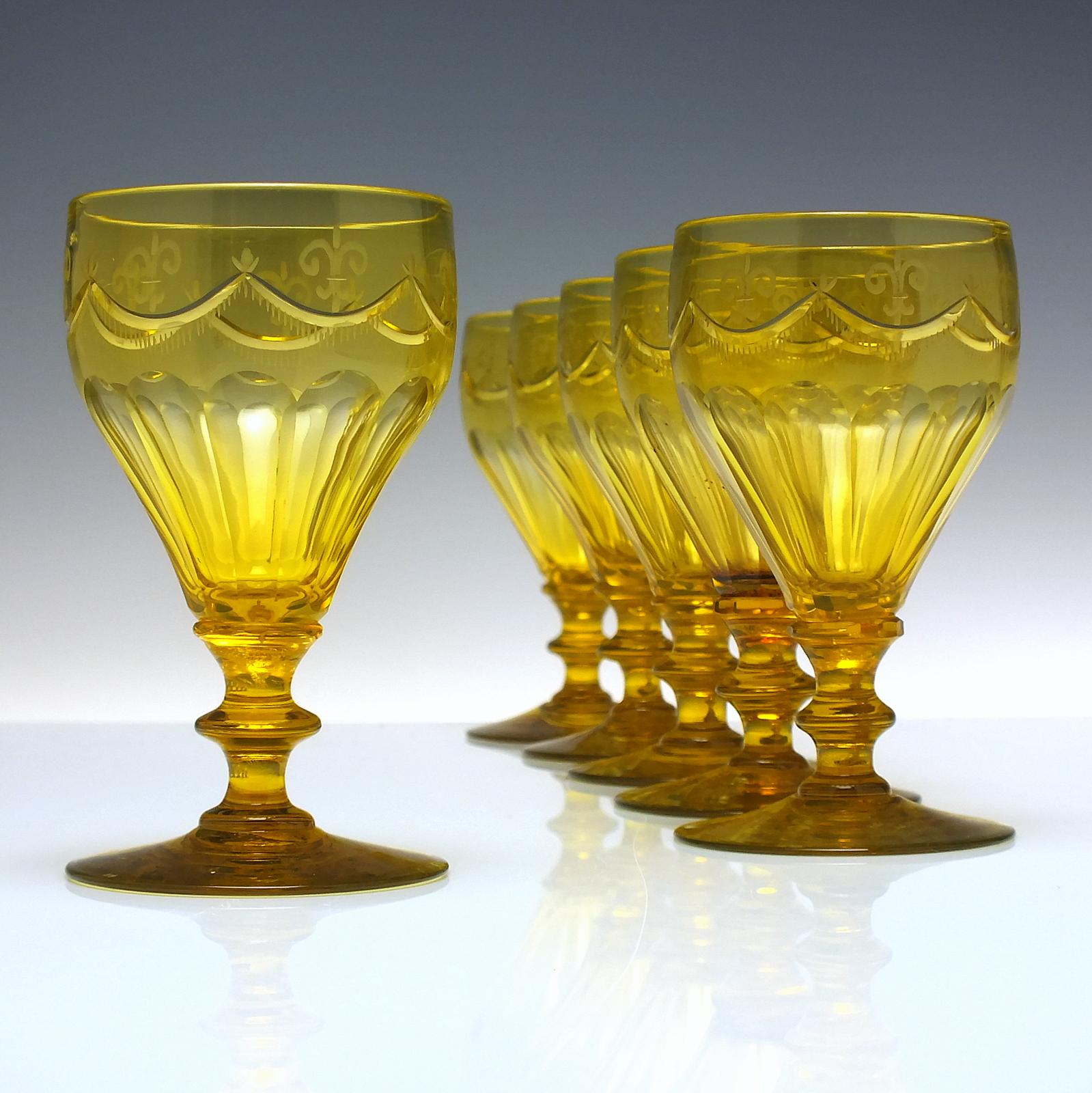 Six Victorian Engraved Amber Wine Glasses c.1870