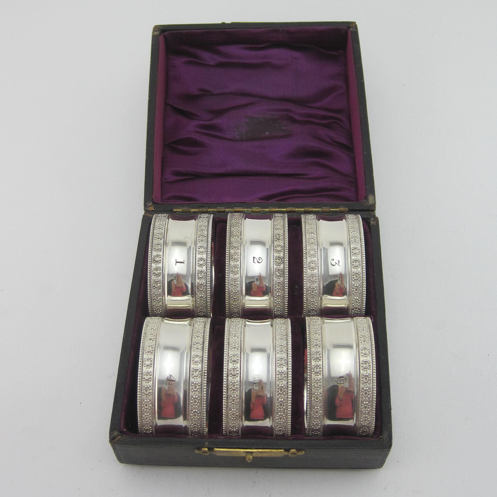 Six Victorian Silver Plated Napkin Rings in Original Leather Bound Box
