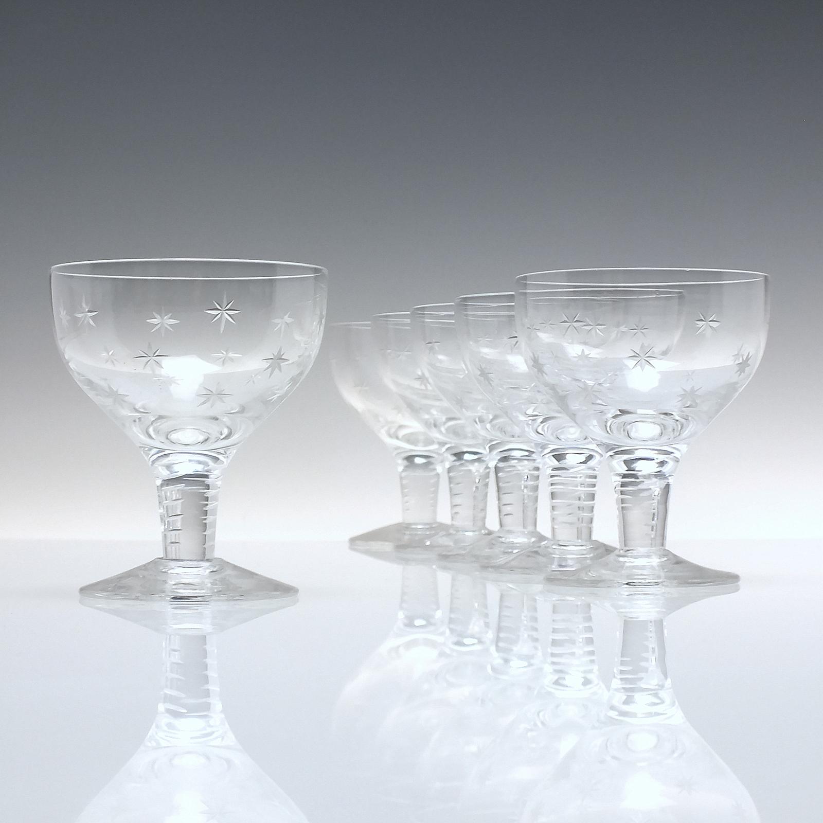 Six Vintage Engraved Stuart Crystal Champagne Glasses C1950