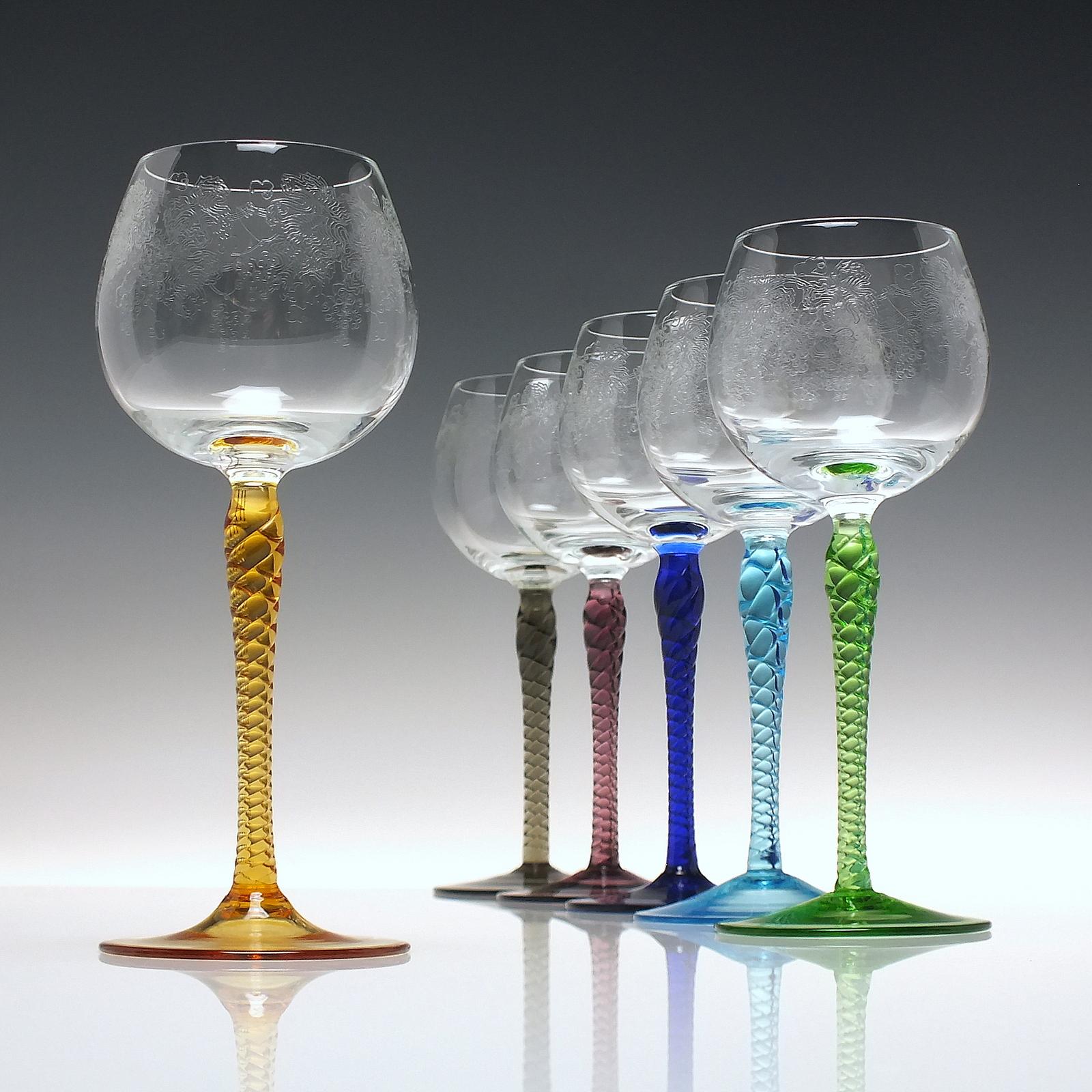 Six Vintage Harlequin Engraved Wine / Hock Glasses C1960
