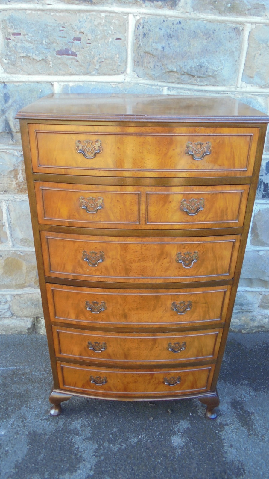 Slim Burr Walnut Bow Front Chest of Drawers c.1920