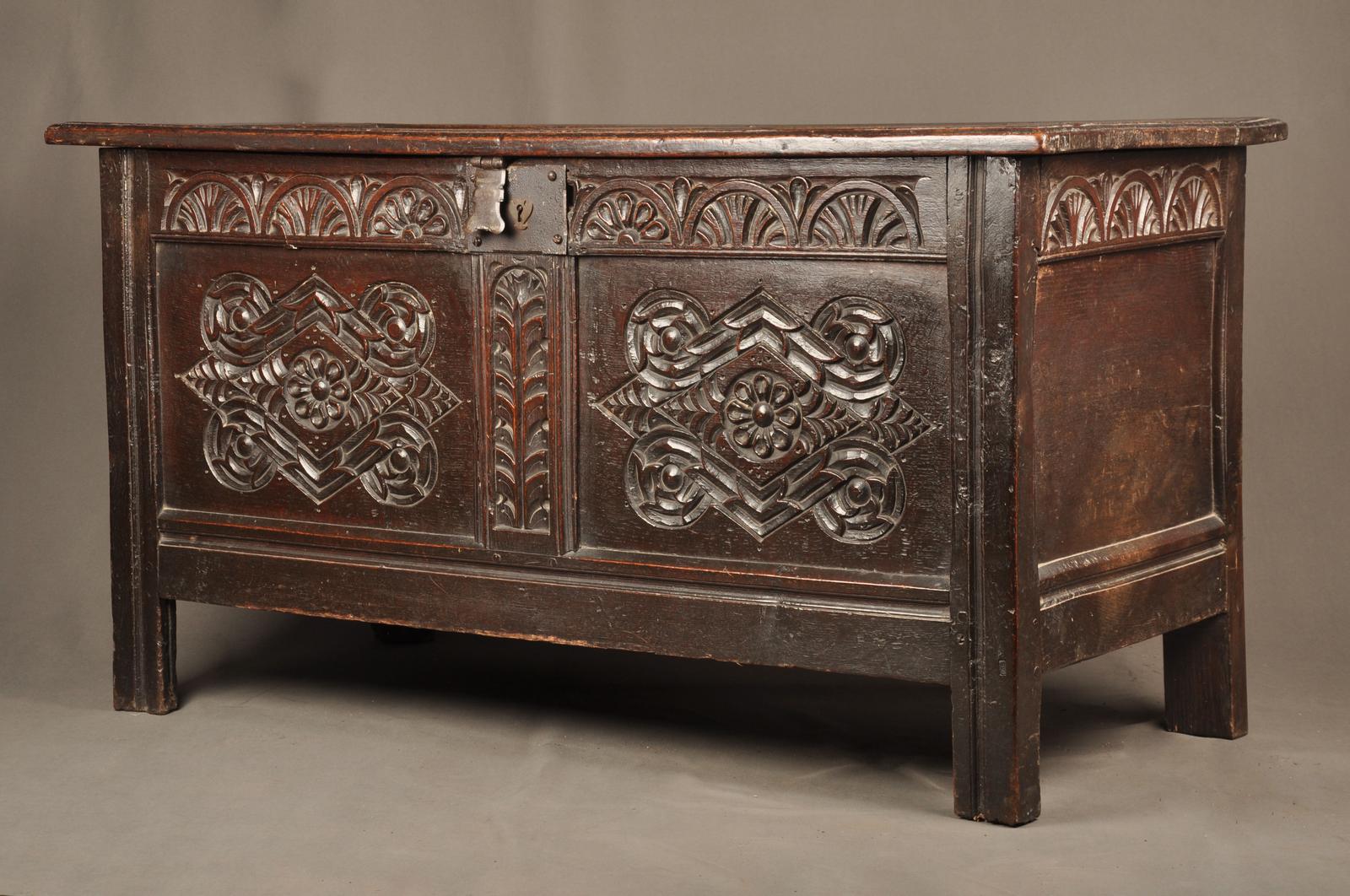 A crisply carved west country Coffer of nice small proportions. The panels carved with lozenge and flowers, the top rail and ends with lunette pattern. Repairs to both back feet and a small blacksmith repair to a side panel. In good solid condition.