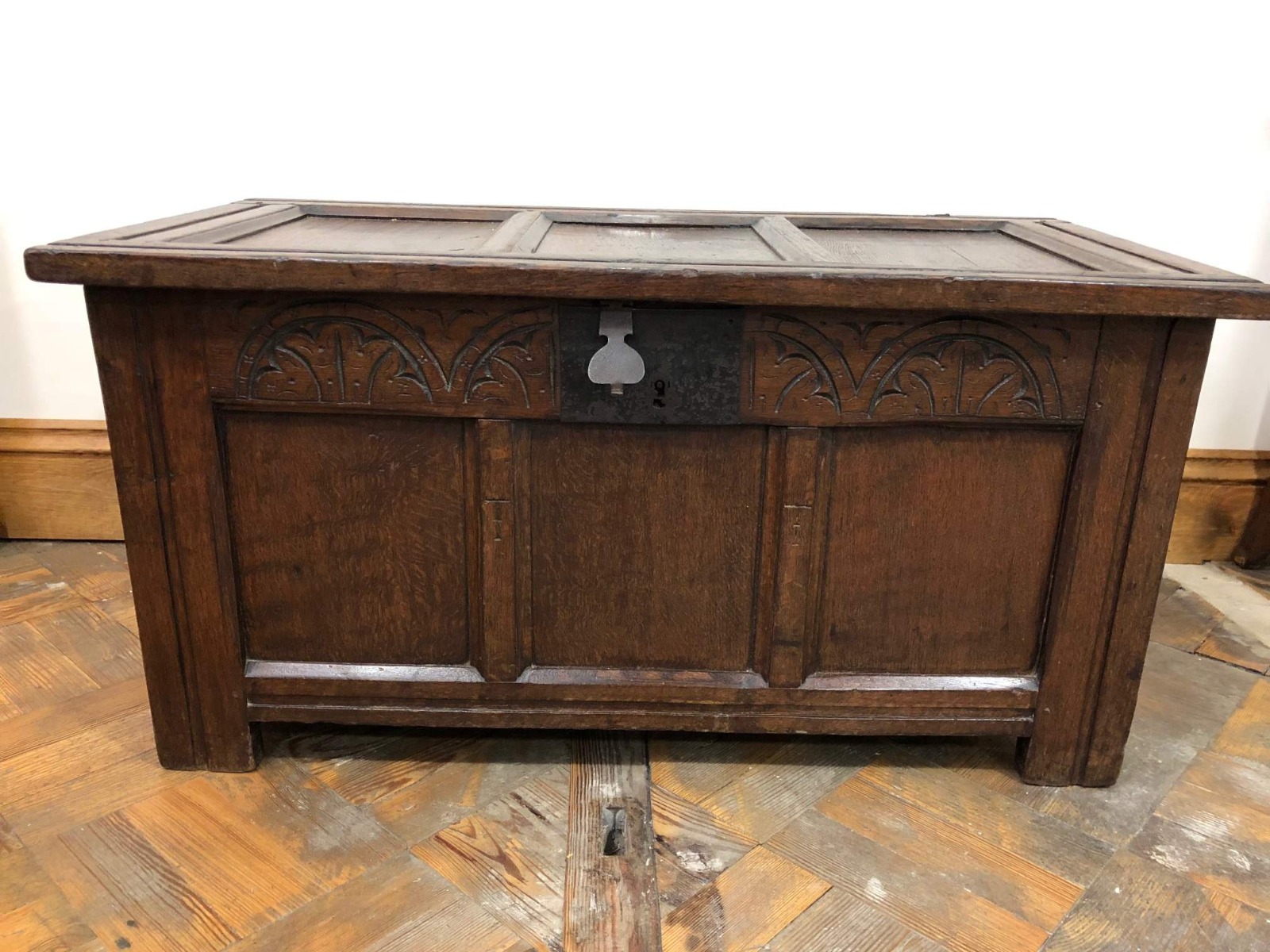 Small 18th Century Oak Coffer with Carved Front & Internal Candle Box (1 of 1)