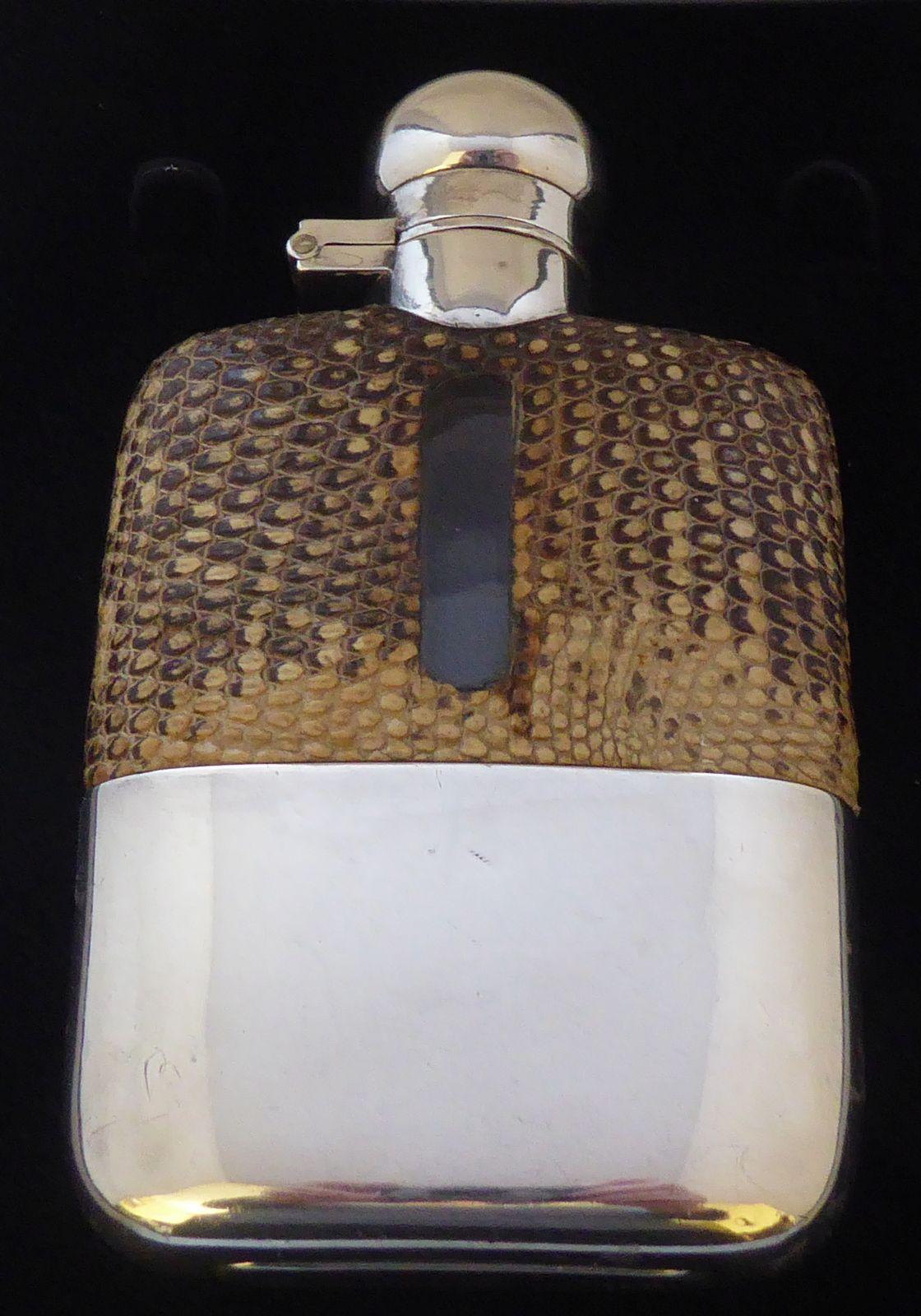 Small 1933 Hallmarked Solid Silver Snake Skin Bound Glass Hip Flask James Dixon