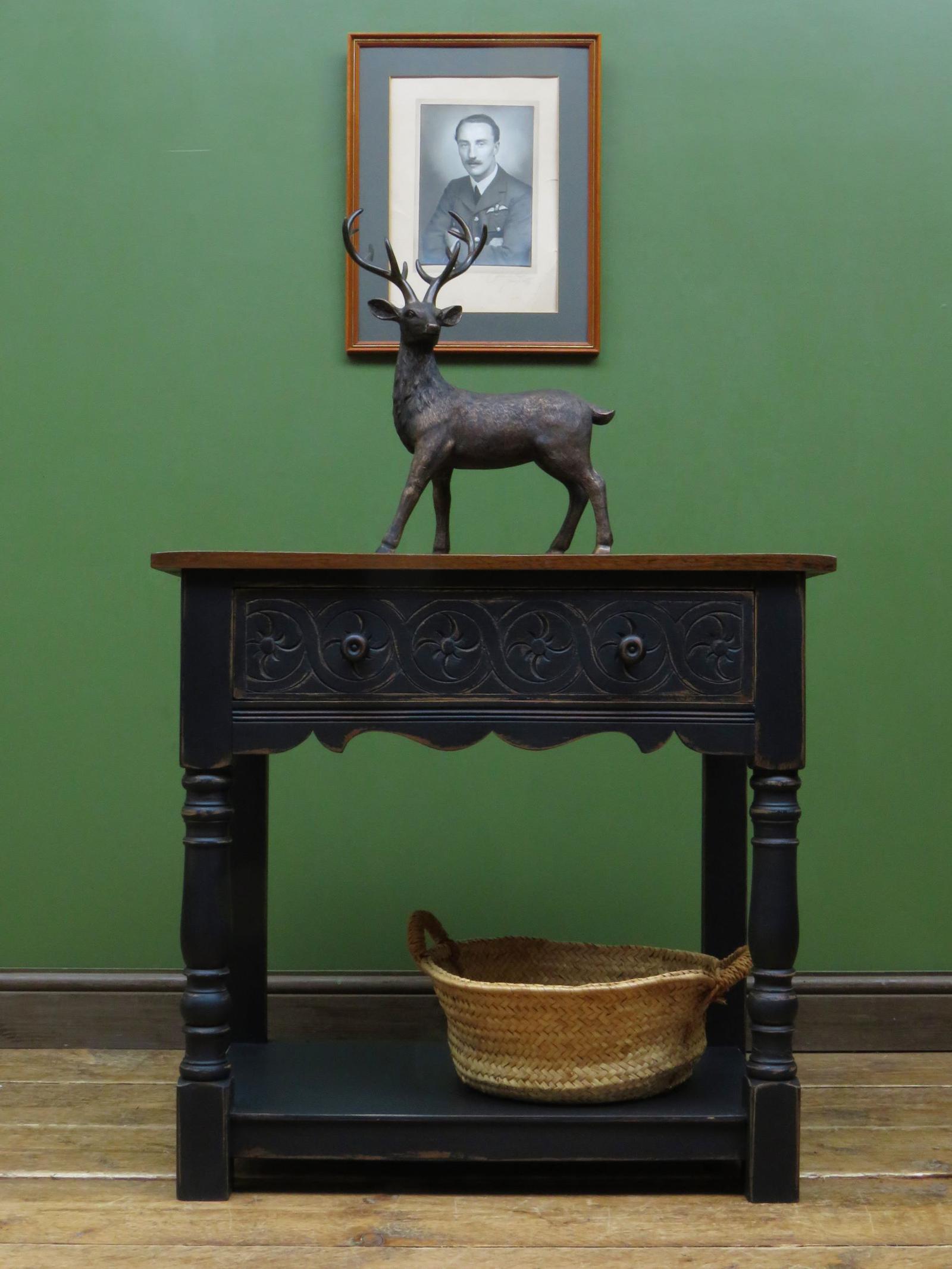Small Antique Black Painted Table with Carved Drawer, Gothic Shabby Chic
