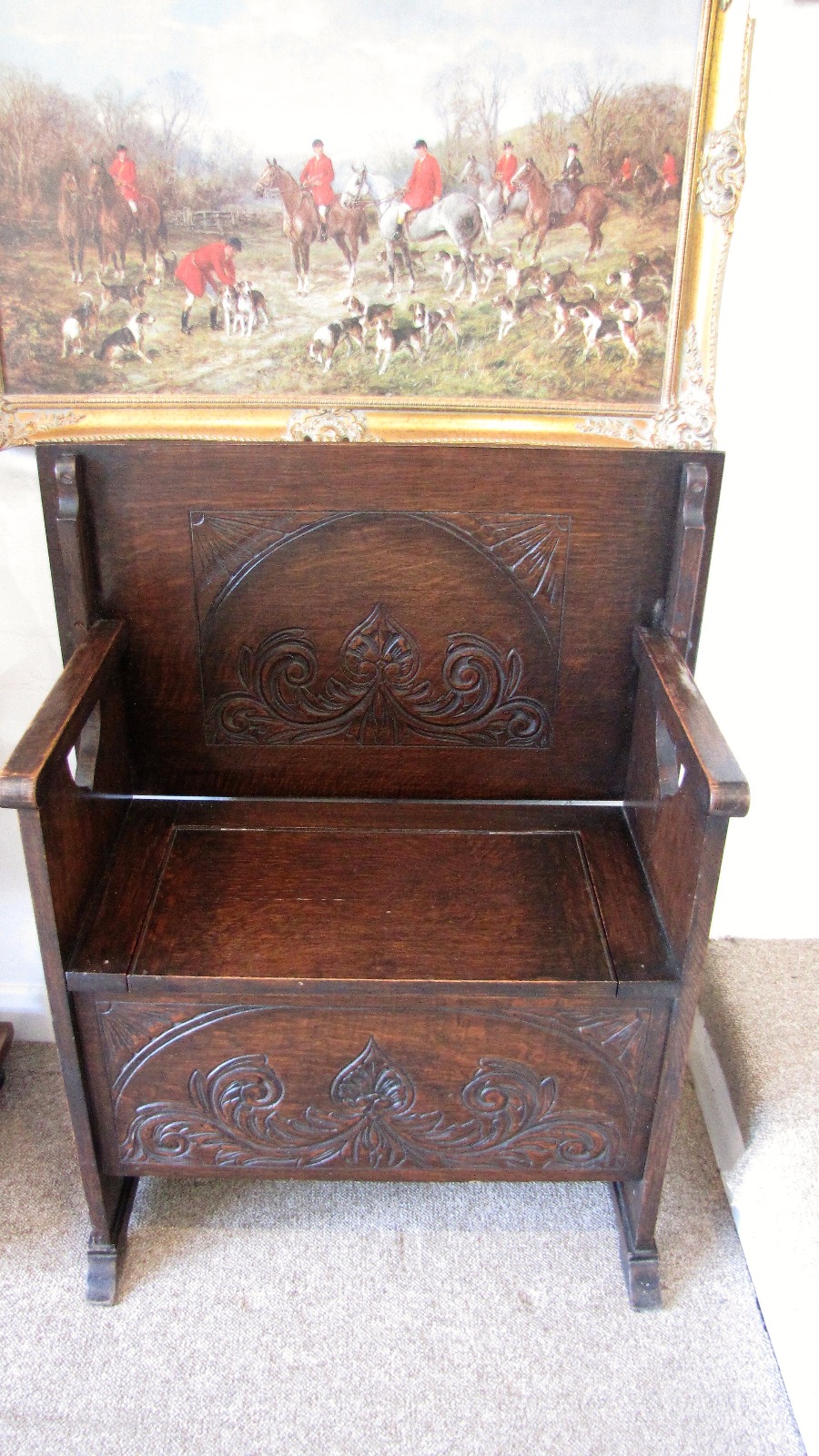 Small Antique Carved Oak Monks Bench
