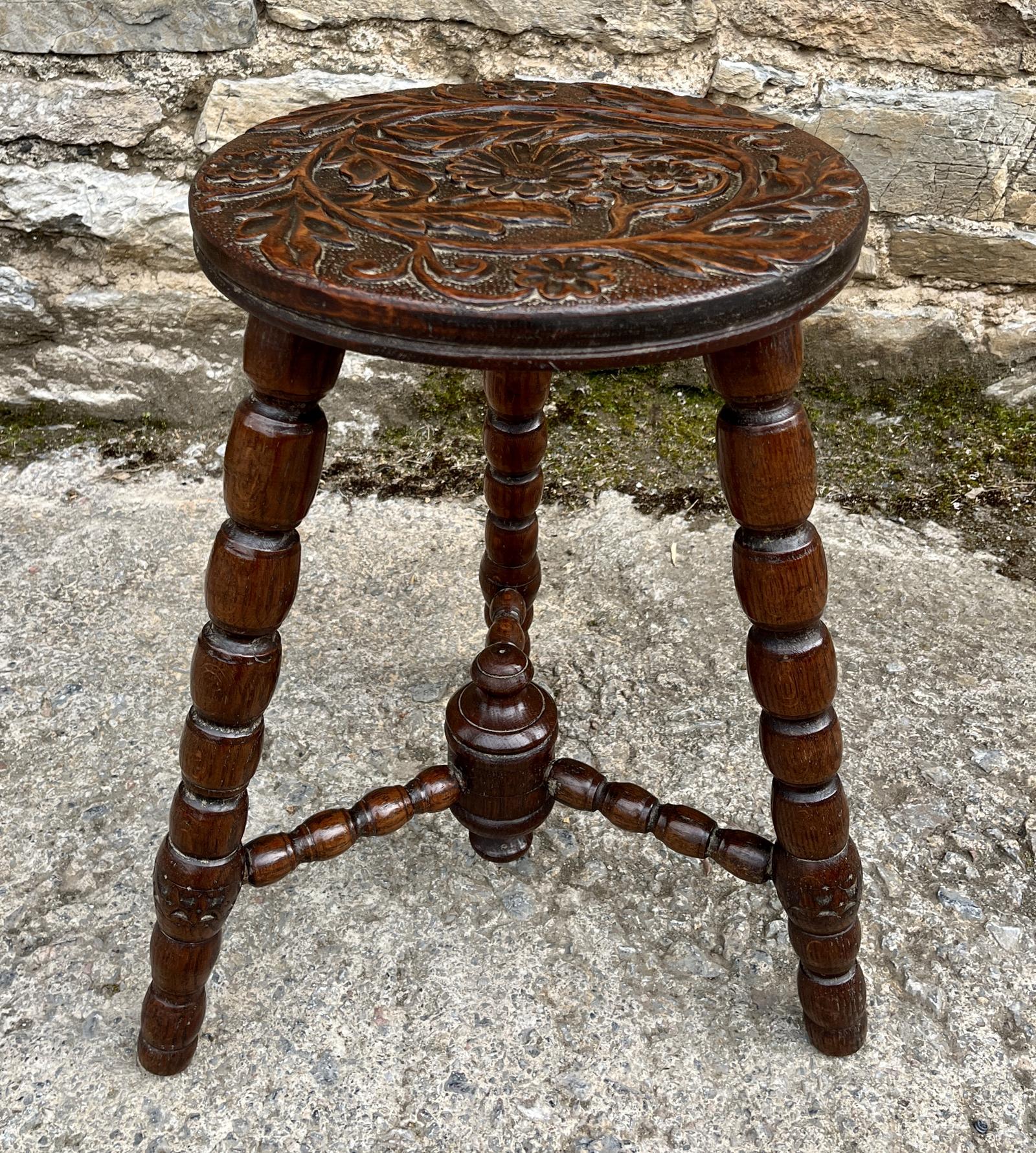 A nice example of a small oak table or stool dating from the late 19th / early 20th Century. It has bobbin turned legs joined by a central stretcher and the round top is decorated with nicely carved leaves and flowers.
