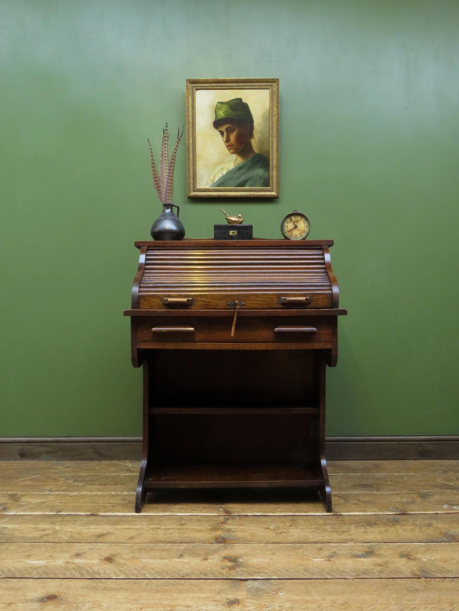 Small Antique Oak Roll Top Writing Desk, Student Desk