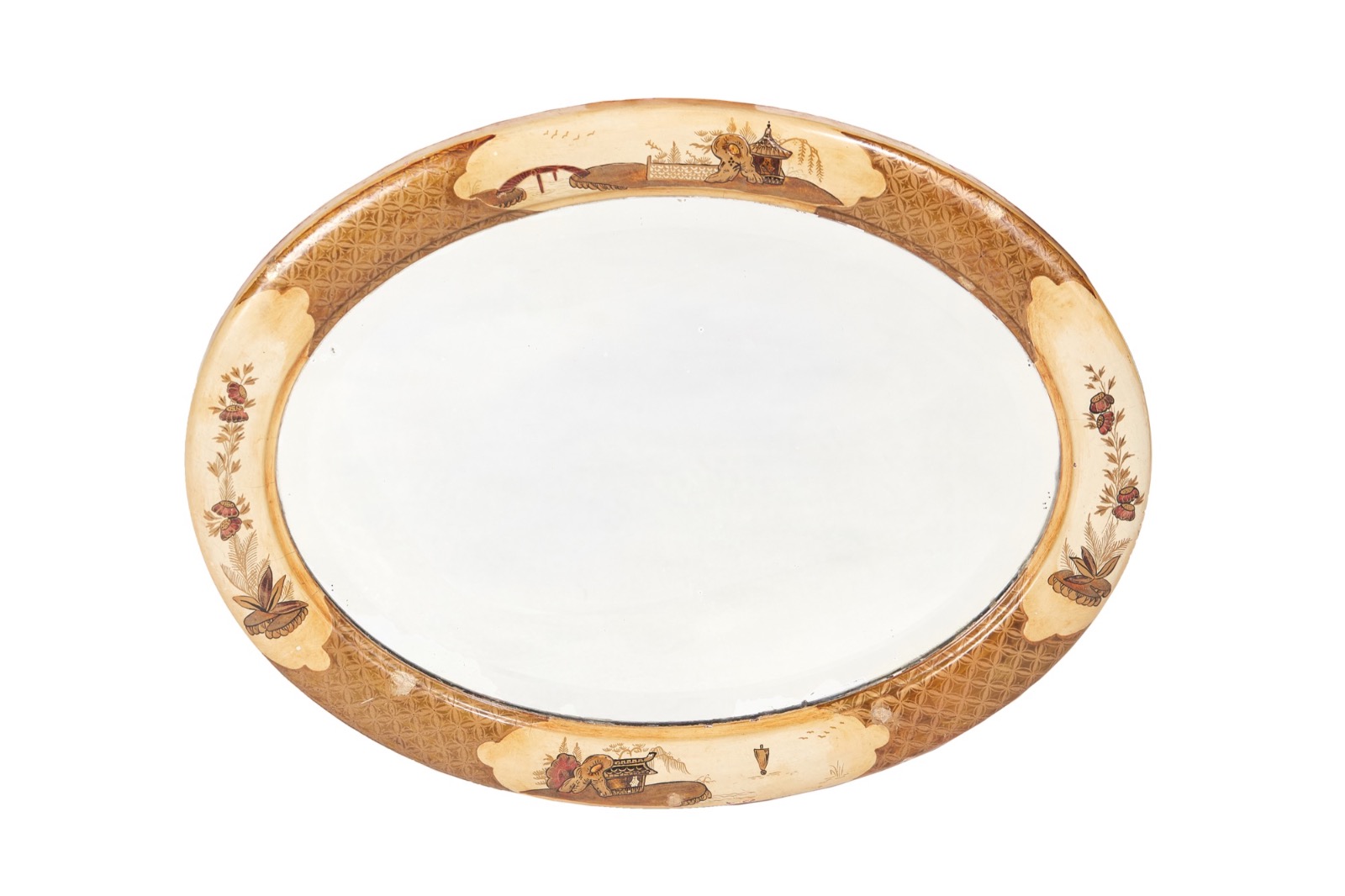 Small Antique Oval Chinoiserie Lacquered Decorated Wall Mirror c.1910
