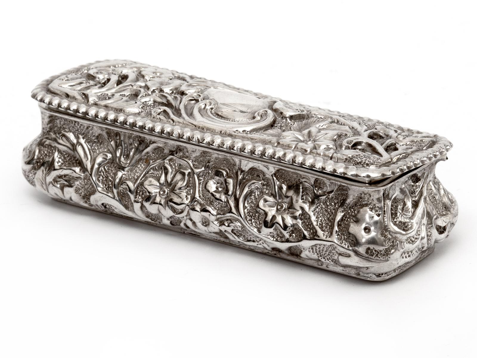 Small Antique Silver Trinket or Jewellery Box with Repousse Floral and Scroll Decoration
