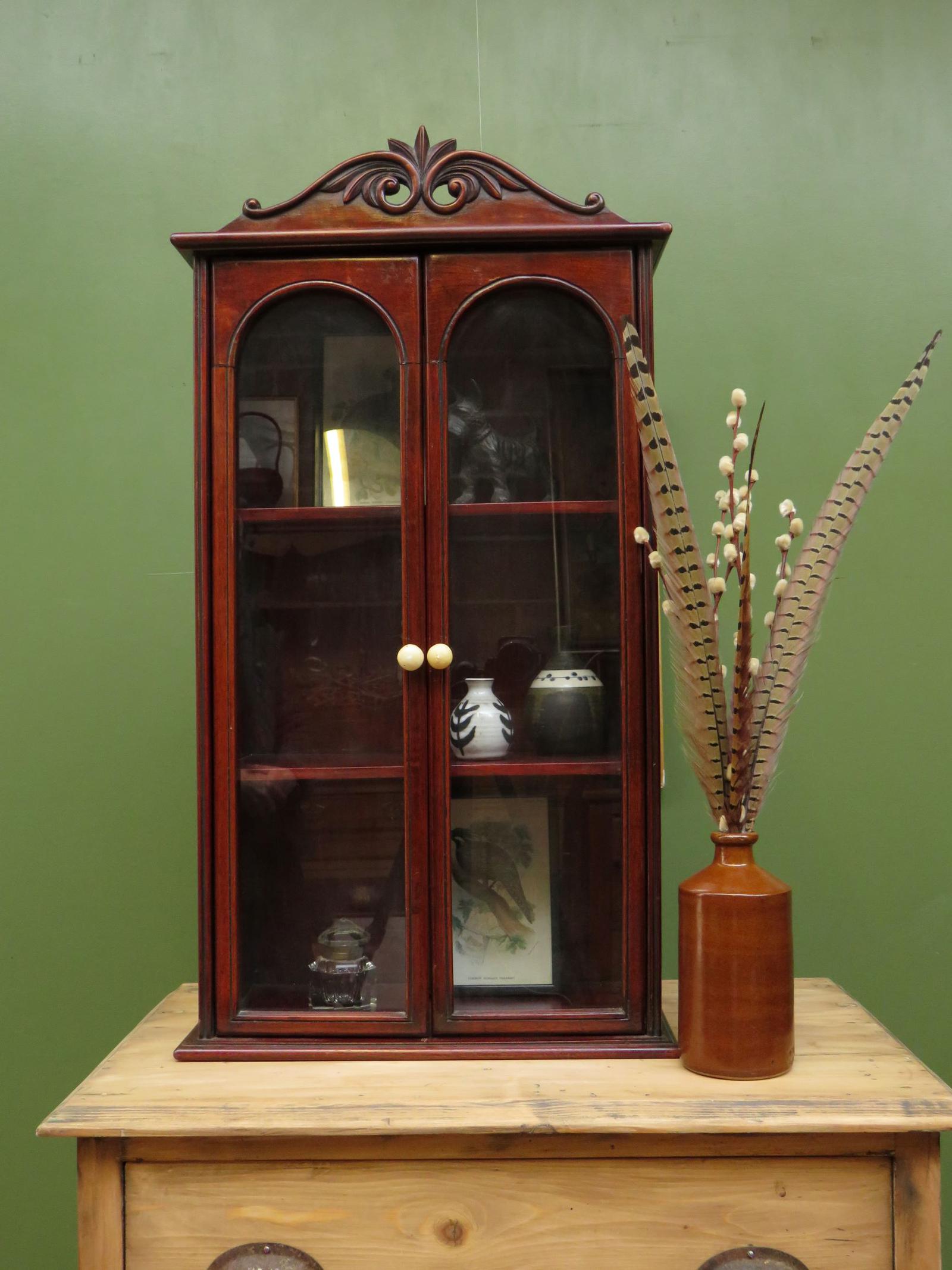 Small Antique Style Collectors Cabinet with Glazed Doors and Decorative Top