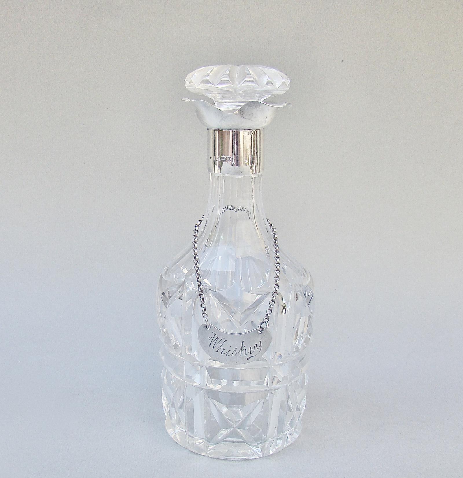 Small Art Deco Silver Mounted Glass Decanter, Birmingham 1928 with Edwardian Silver Whisky Label, London 1904