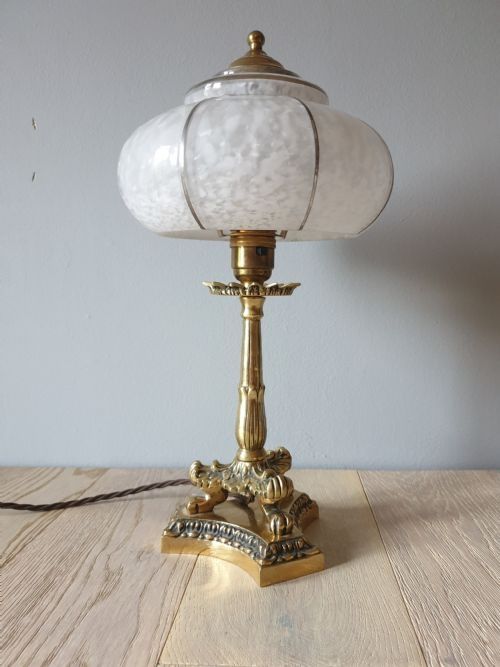 Small Brass Lion Foot Table Lamp with Opaque Glass Shade, Rewired & Pat Tested c.1910