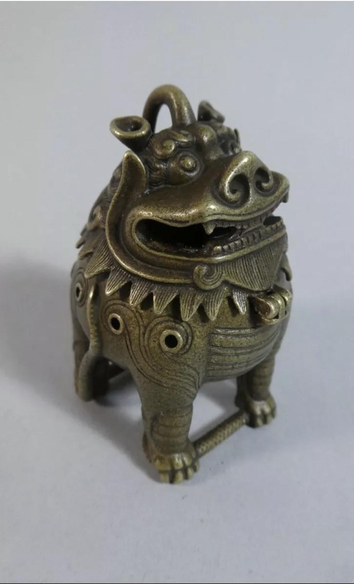 Small Bronze Koro Squat Temple Lion Standing on a Snake