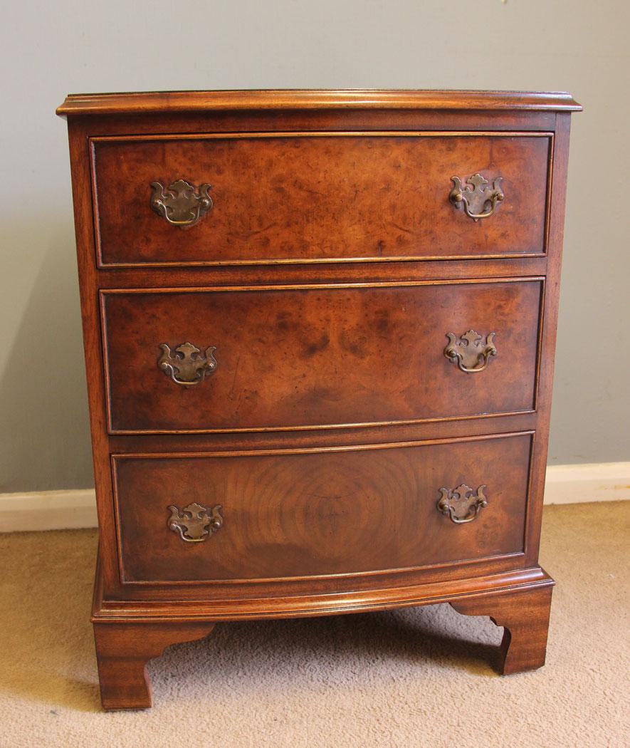 This lovely burr walnut bowfront small chest of drawers has a burr walnut top with moulded edge under having three graduated drawers with lovely burr walnut drawer fronts all standing on short bracket style feet.