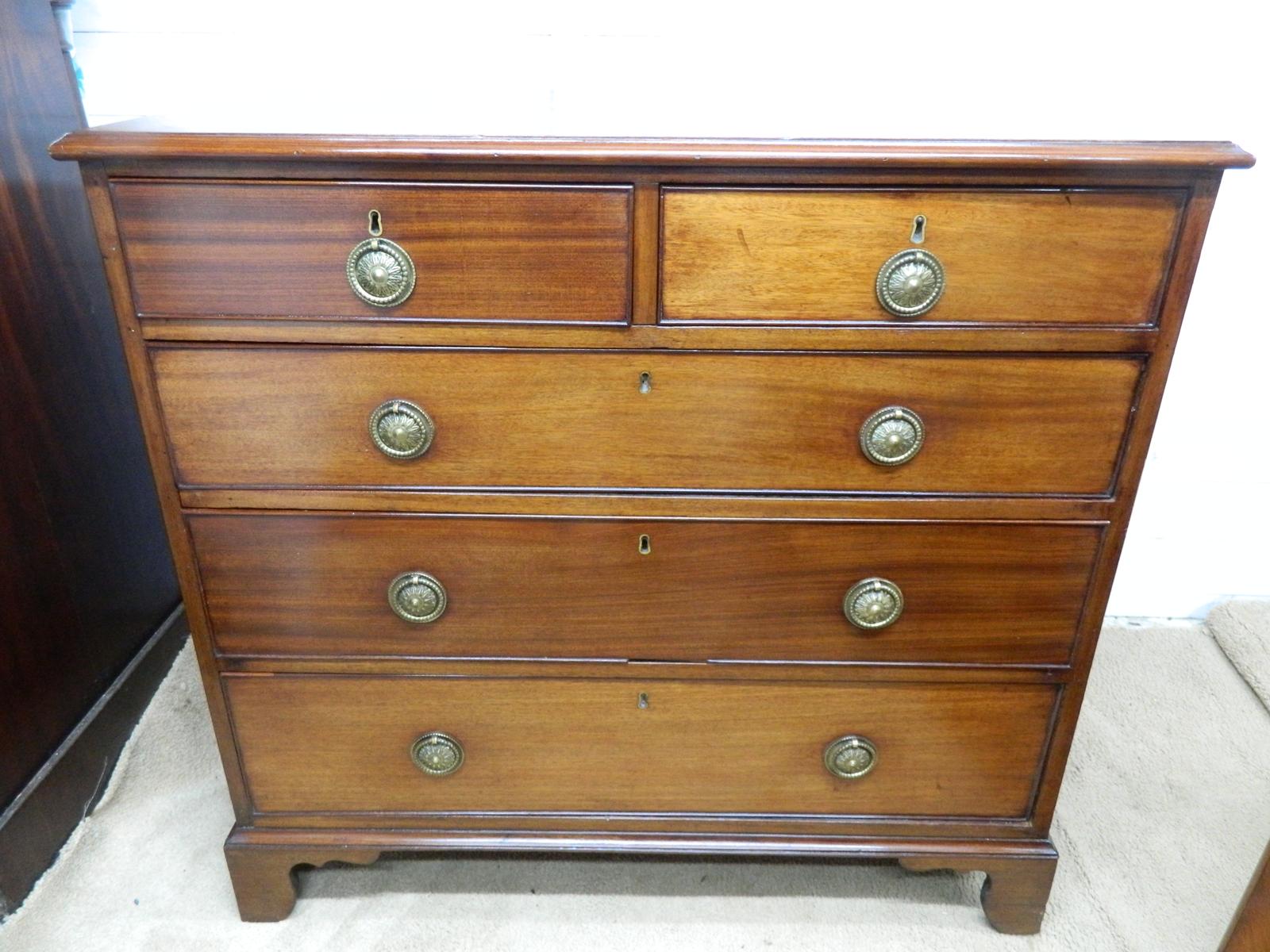 This chest of drawers has 2 short over 3 long graduating drawers, all slide freely all locks in place with pine lined draw bases, no knots missing, It has starburst ring-pull brass handles. There is an old split in the top, adding charm and character to a chest over 100 years old, with some age related marks. Please see all pictures for condition