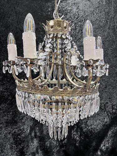 Here we have a classic antique French Empire chandelier with four waterfall tiers, with a decorative leafy top crown from which crystal button chains hang down into the bobeche drip pans and crystal drops with icicle drops hang down into the centre. An ornate circular brass ring issues six external leafy arms each holding pear drops and crystal buttons. The bottom waterfall is of four graduated rings holding icicle drops and crystal buttons and three internal lights shine through the waterfall crystals giving a pretty glow around the room.