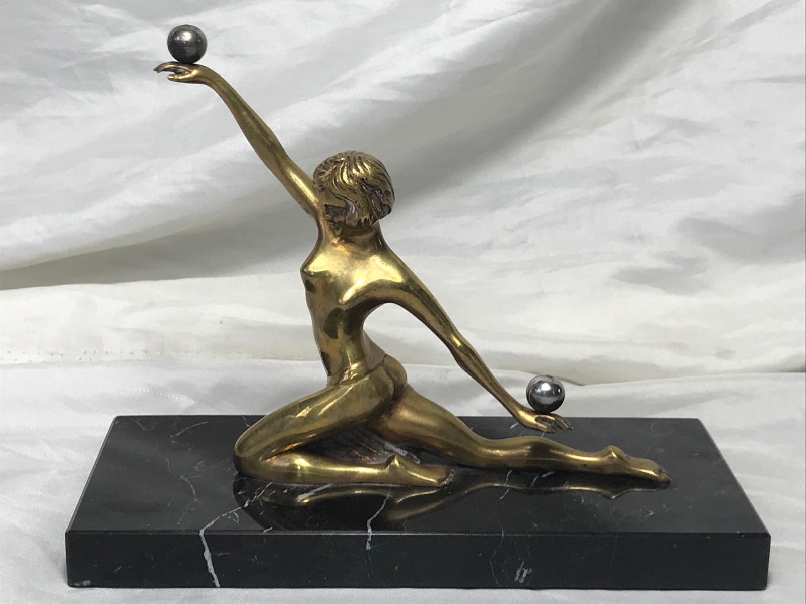Small French Original Art Deco Gilt Bronze Erotic Nude Acrobat Lady Dancer After Serge Yourievitch