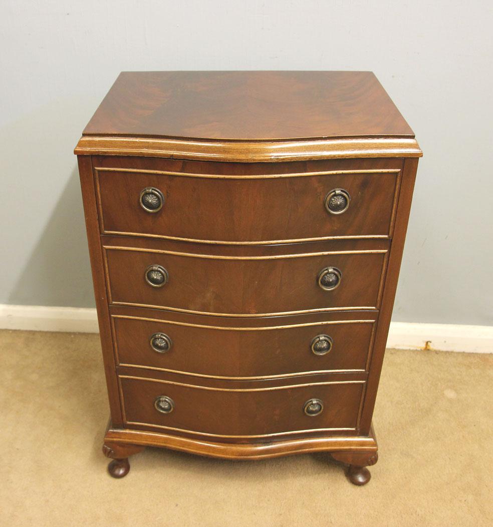 This small 'Georgian style' mahogany small serpentine shaped bedside chest of drawers has a figured mahogany top with four drawers under supported by short Queen Anne style legs, This chest of drawers dates from around the mid 20th century