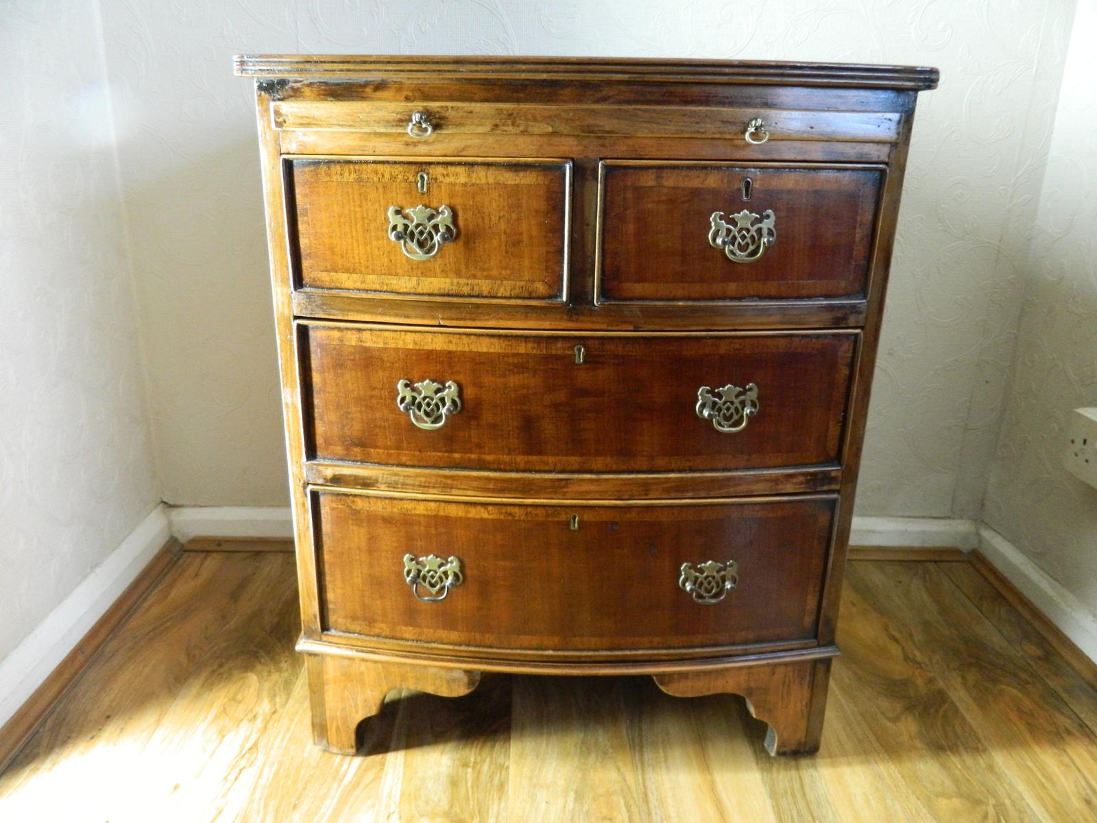 This small Mahogany Georgian Style Bow Fronted Chest of Drawers is an antique piece from the early 1900s, making it a valuable addition to any room. With a solid pattern and brass handle material, this chest of drawers exudes elegance and charm. The bow fronted design and Georgian style bring a touch of classic sophistication to any space, while the 4 drawers provide ample storage for your items. Standing at 74cm in height and 47cm in width, this chest of drawers is a timeless and stylish choice for your home. The 4 drawers consist of 2 short over 2 long graduating, they are oak lined making them very strong, all locks in place no key, all slide freely, the swan neck brass handles with decorative backplate, add a touch of style and sophistication. The brushing slide can be pulled out and be used for a computer desk for your laptop, or like in the Georgian times these where used for gentlemen to hang their trousers over, The chest stands on bracket feet. There are signs of old wood worm long gone now, and age related marks with an old ink stain on the top, possibly someone spilt a pot of ink. Please see all pictures for condition