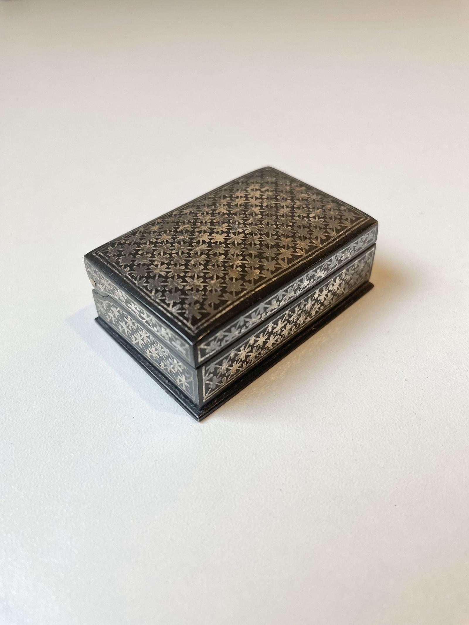 Small Metal Snuff Trinket Box with Inlaid Silver Damascene Work