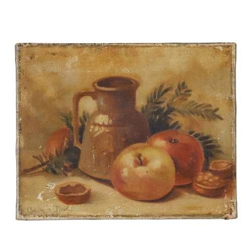Small Oil on Canvas Still Life Painting of Fruit and Jug 1885
