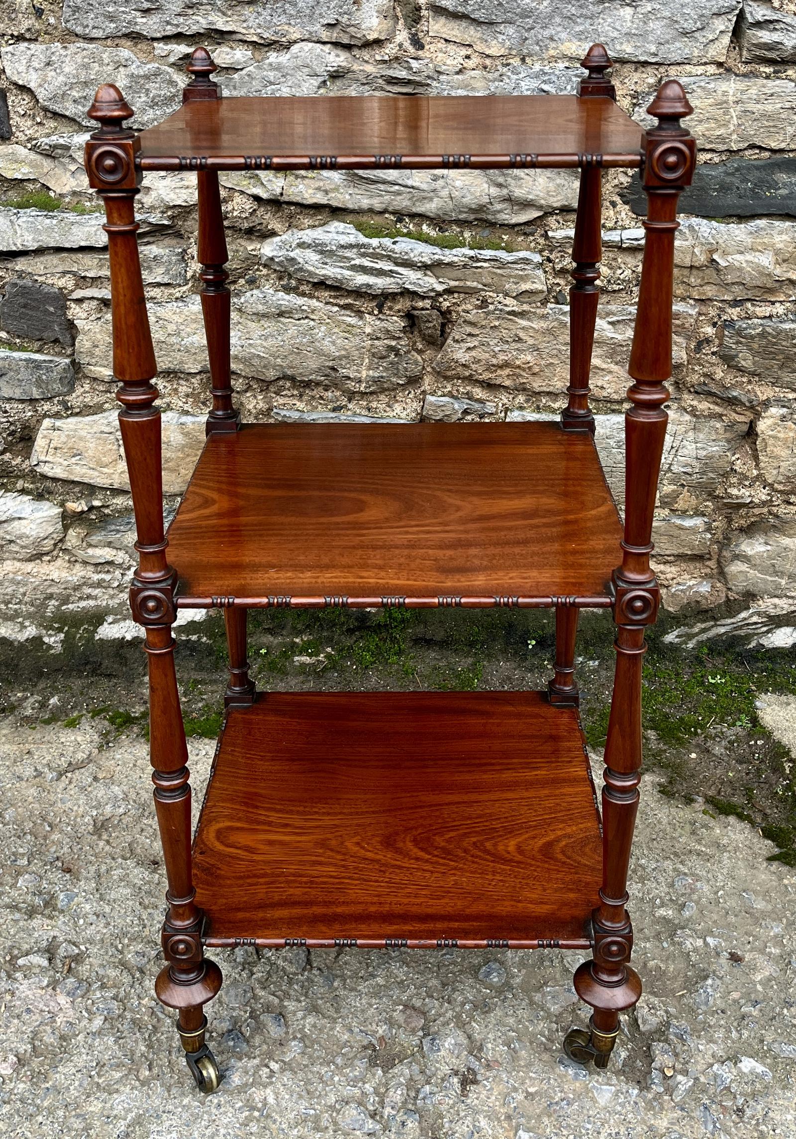 A good quality three-tier mahogany whatnot dating from the early 19th century. It has elegant turned supports adorned with roundels and turned finials. Each shelf has a decorative 'sausage and pea' border and it stands on bulbous feet with brass castors. It is in good condition for its age and is a good quality piece with lovely rich timbers. There are some minor signs of age and use, some light marks and knocks and a couple of small sections of border are missing on one side but overall it displays very well. It has been cleaned and gently polished and is ready for use. The best description comes from the photos so please look at them all carefully and if you have any questions just ask. Nationwide delivery available through our network of reliable couriers. Please get in touch for an accurate quote to your location.