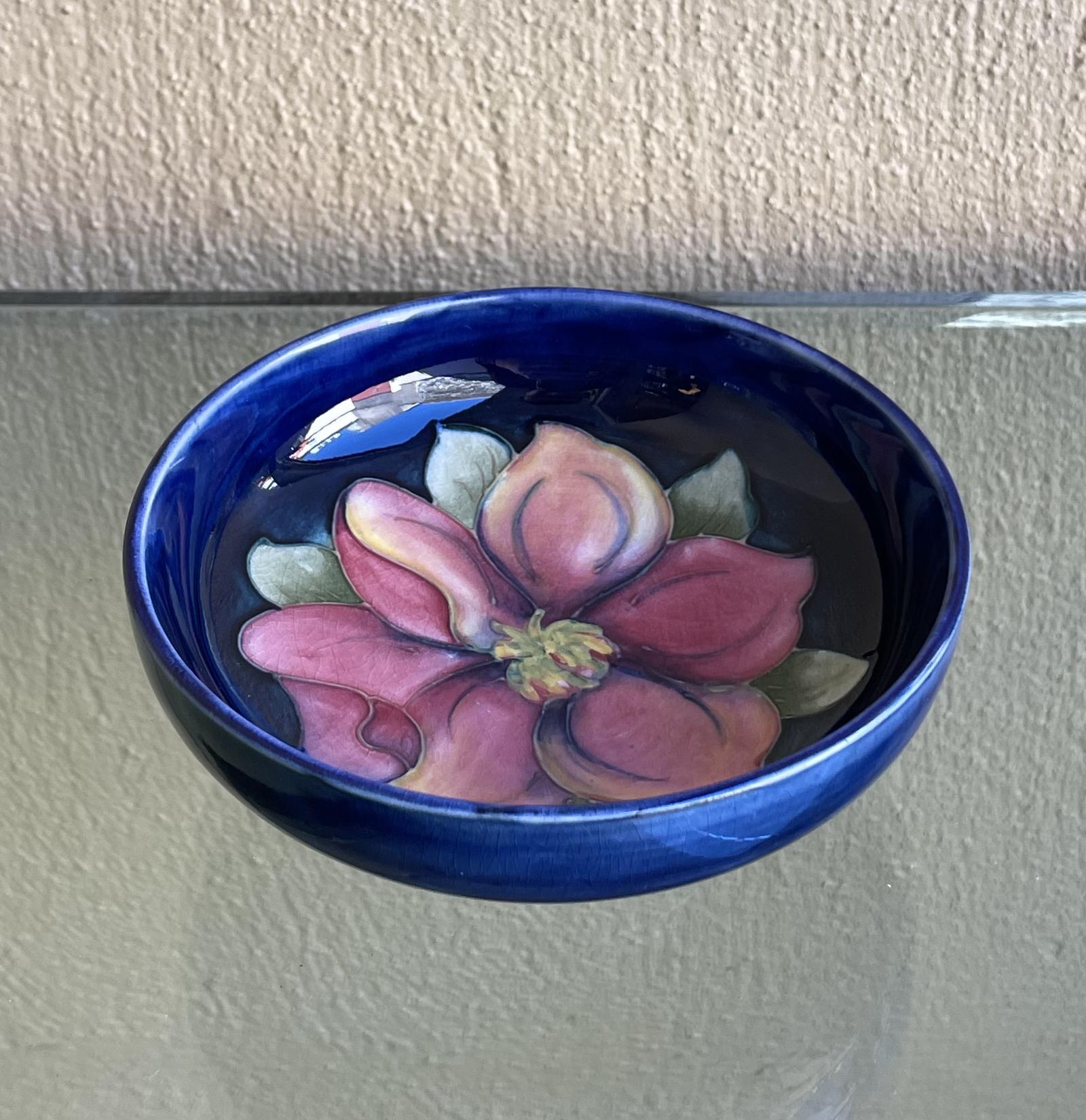 Small Shallow Moorcroft Dish in the Clematis Pattern on Cobalt Blue