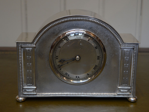 Small Silver Plated Mantel Clock By Harrods, England, c.1920
