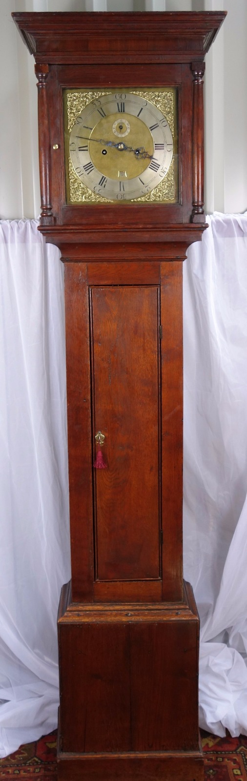 SMALL SLIM EARLY 18TH GEORGE II OAK CASED BRASS DIAL 8 DAY GRANDFATHER LONGCASE (1 of 1)