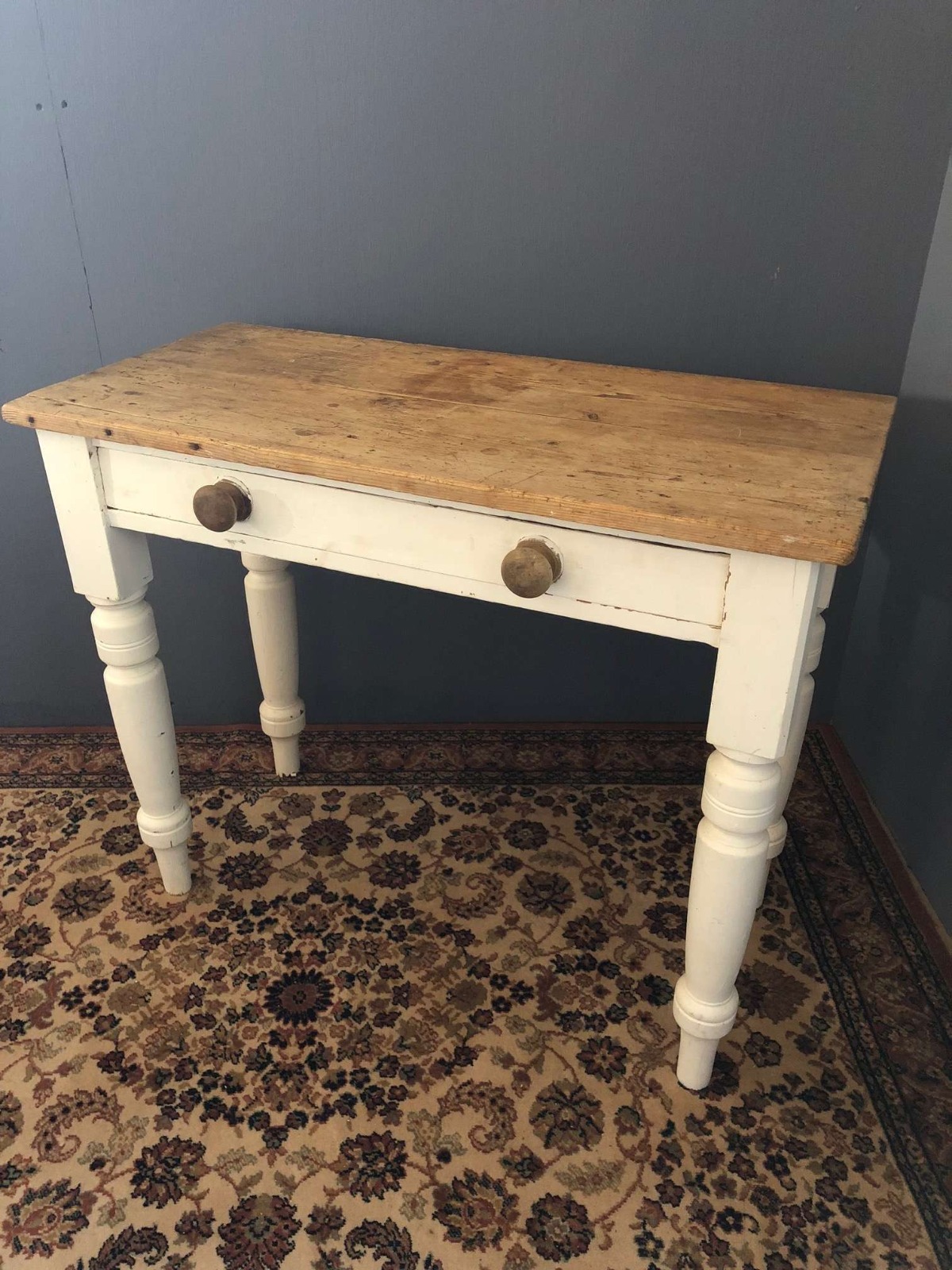 Small Victorian Pine Farmhouse Table with Single Drawer & Painted Base
