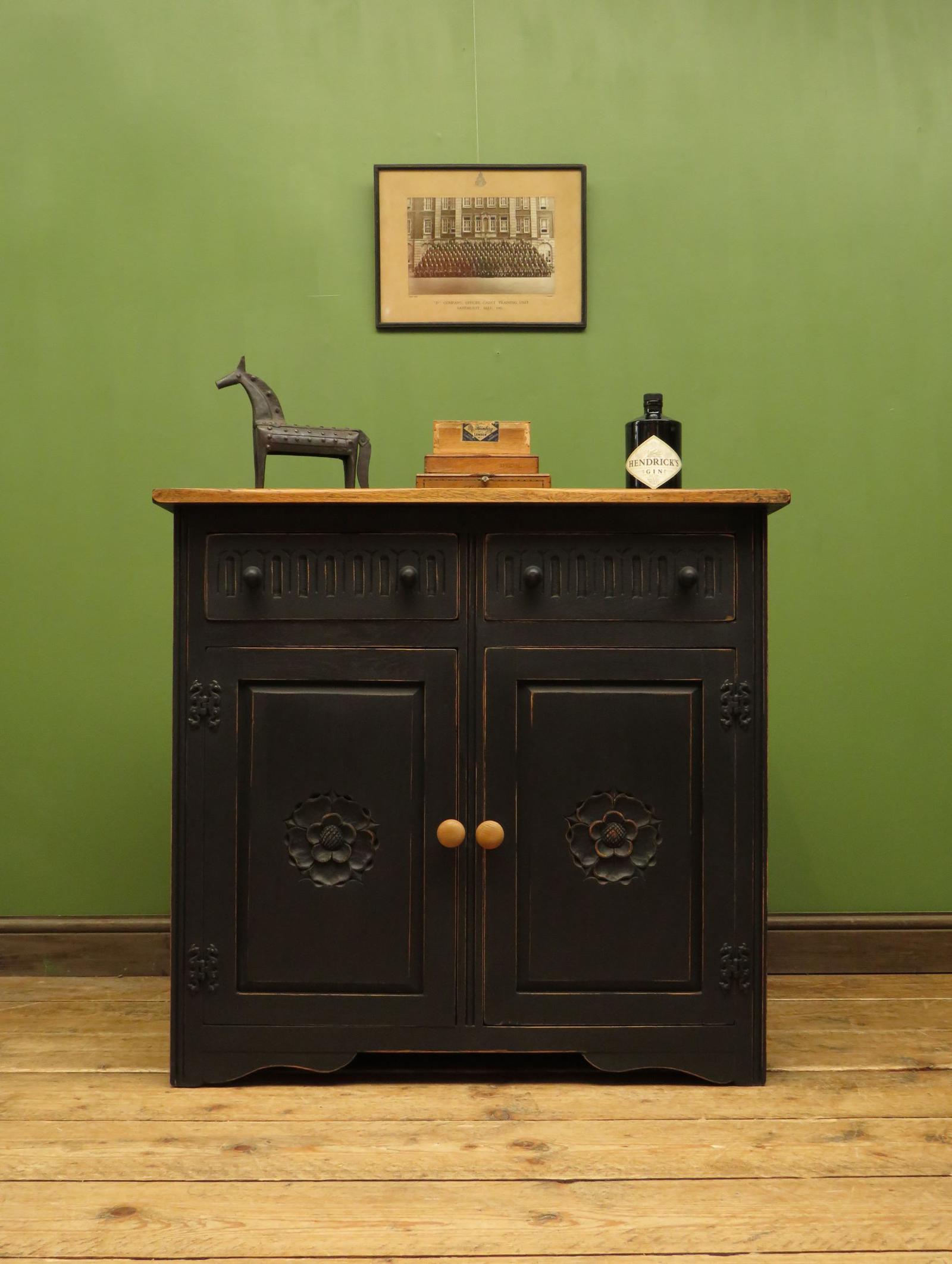 Small Vintage Black Painted Sideboard, Kitchen Cupboard with Carvings