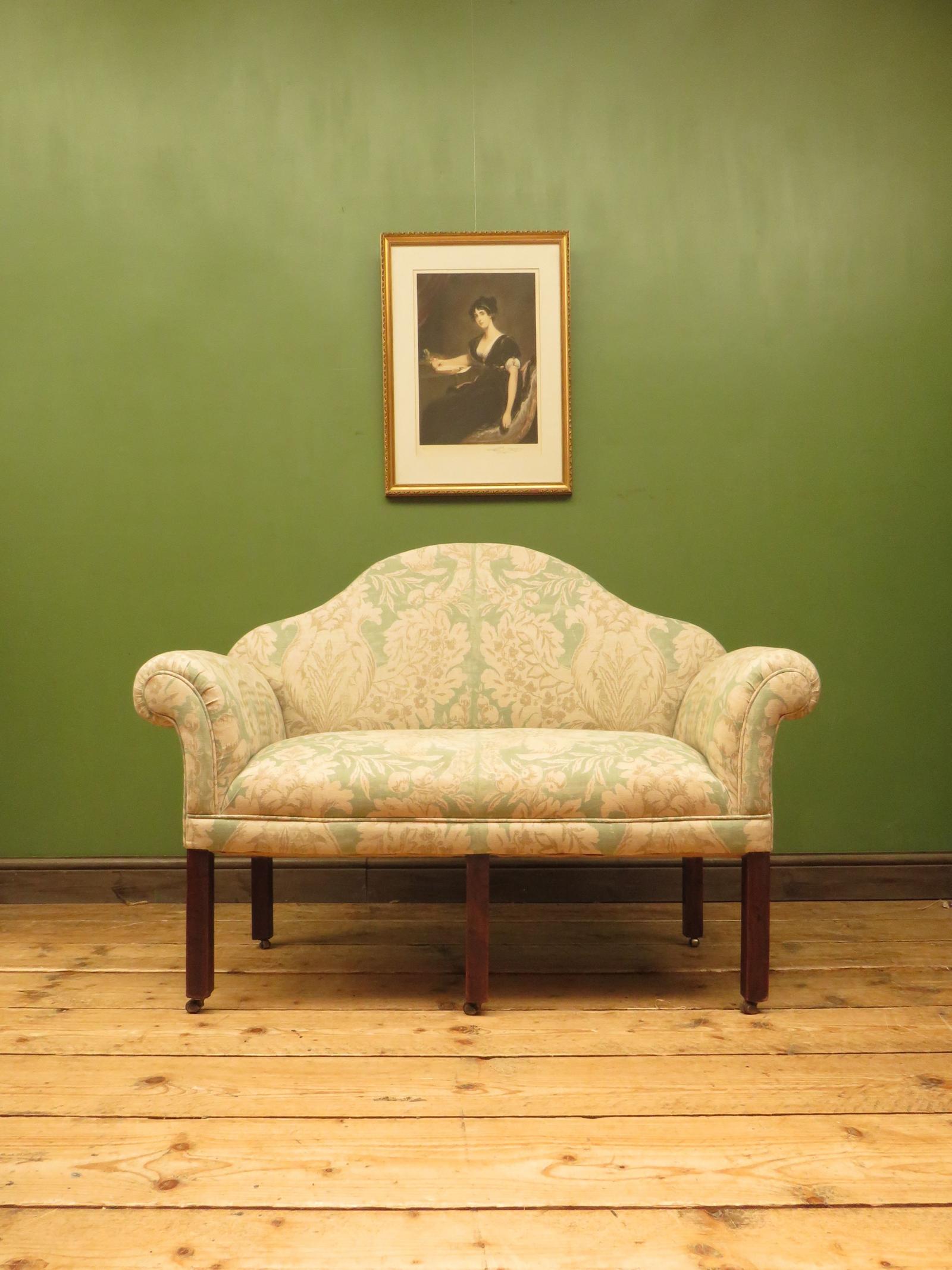 Small Vintage Camel Backed Sofa Window Seat with Linen Upholstery