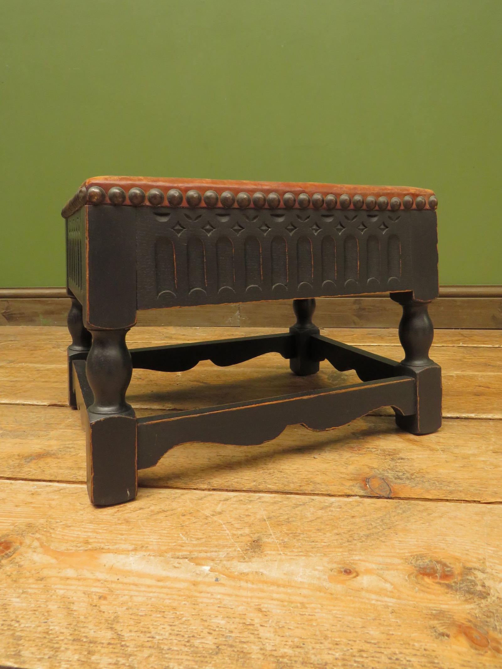 Small Vintage Wooden Black Painted Foot Stool with Brown Leather Top