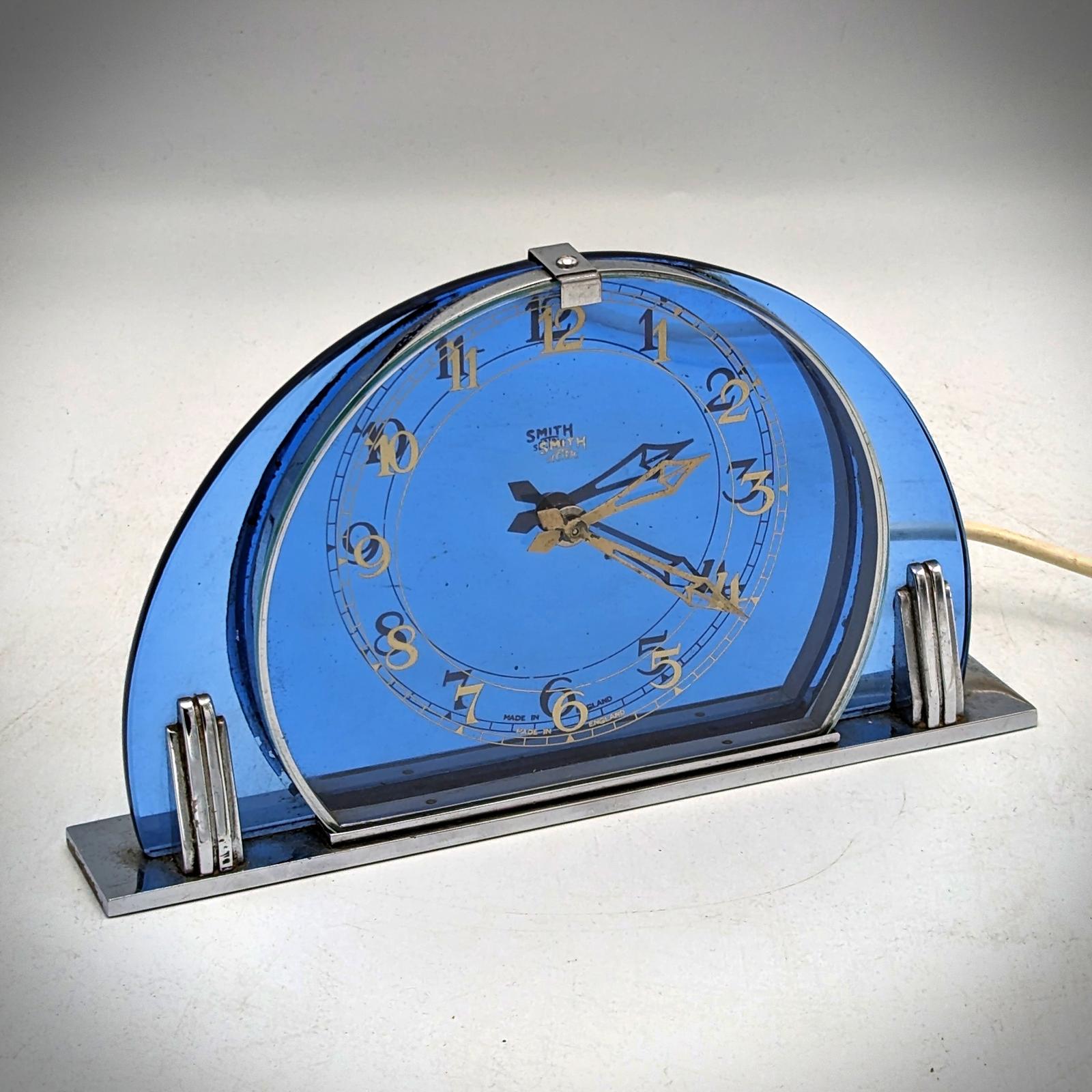 Smiths Art Deco Blue Glass Electric Mantel Clock