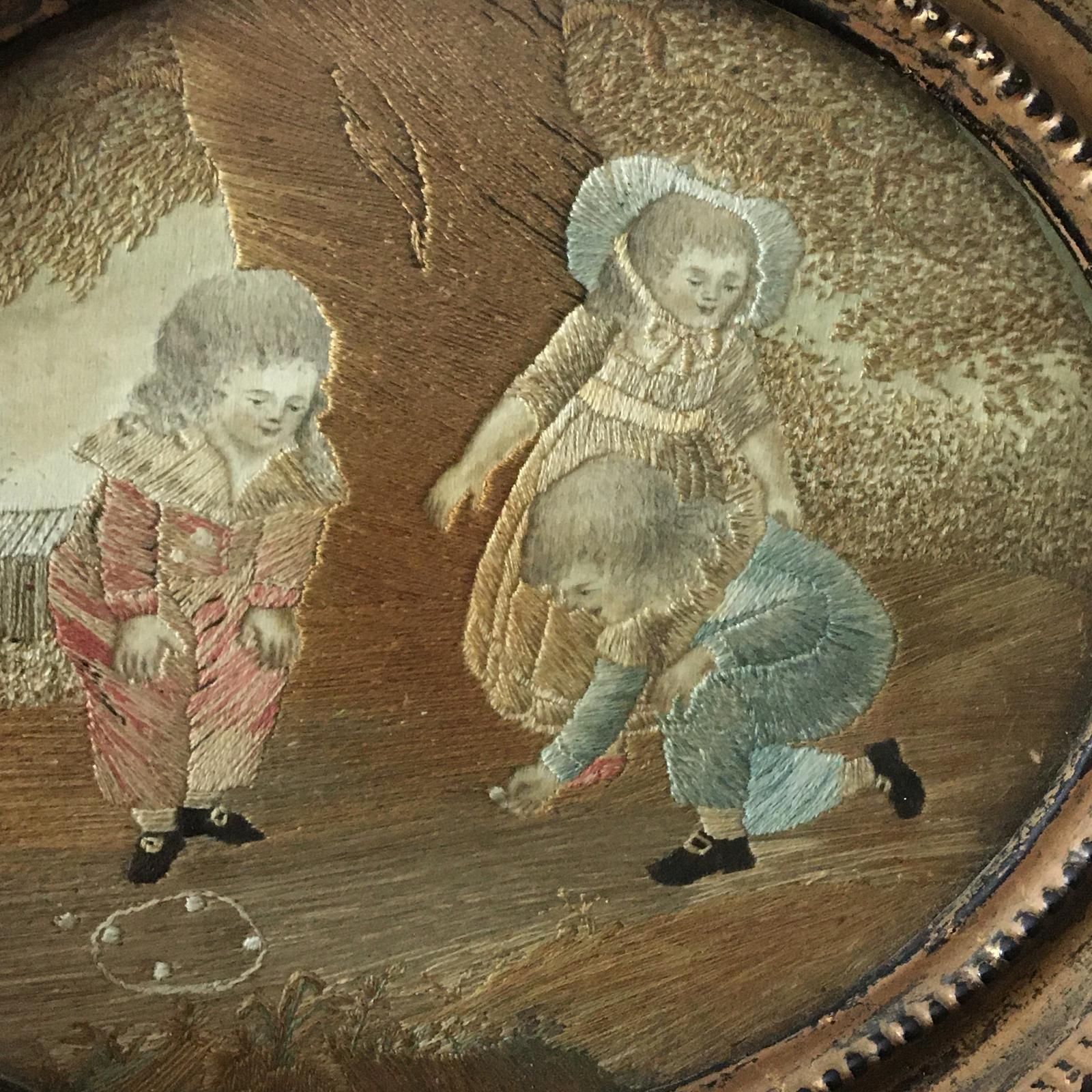 So Very Sweet Georgian Silkwork of Children Playing a Simple Game of Marbles